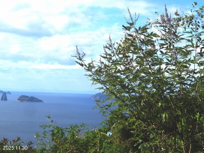 ある海沿いのレストランの花壇で見ました。高さ3mほどの樹木のように思いますが、紫色の花が咲いていました。この店のオーナーさんに聞きましたところ、その名前は『メド―セージ』とのことでした。『メド―セージ』は、『サルビア・グラニチカ』と同じとする意見もありましたが、本当は、『サルビア・プラテンシス』を指すとされています。