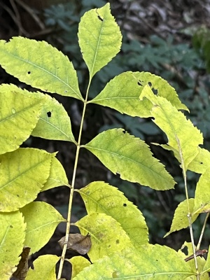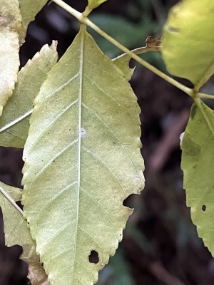 小葉は5対程度で、やや粗く不揃いな鋸歯が観えます。8対程度の側脈がやや弧を描いて葉縁近くまでほぼ平行に伸びています。