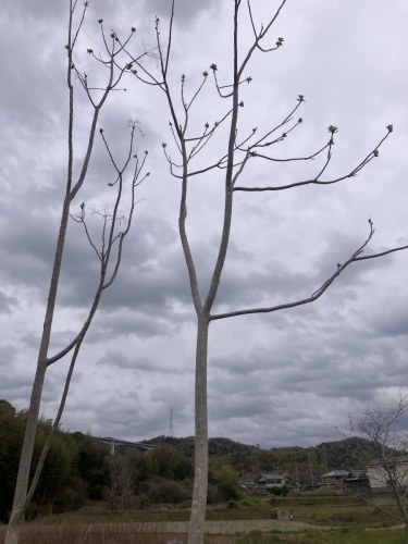 とても高くて 冬の間に 葉はすべてなくなります 上の方に枝が少ないですがあります 今時期 葉っぱがその先端から出かけています