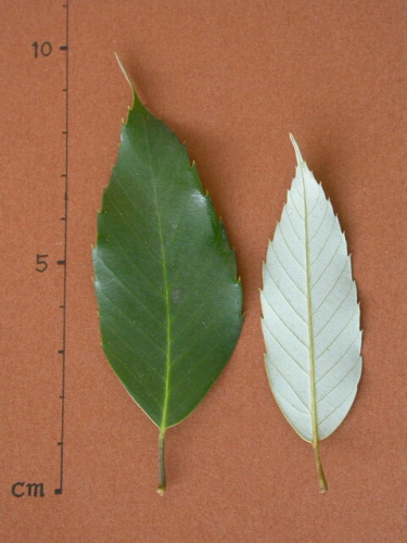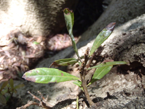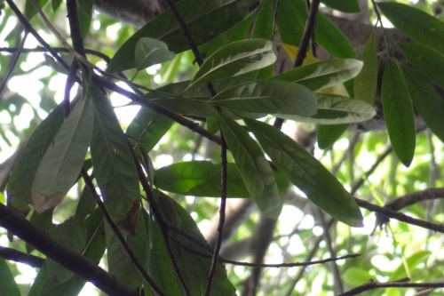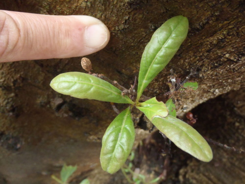 互生で全縁の常緑樹、葉先は短く突き出て鈍く、最大幅は葉先寄り、葉裏は粉白色、樹皮は灰褐色で皮目があります。