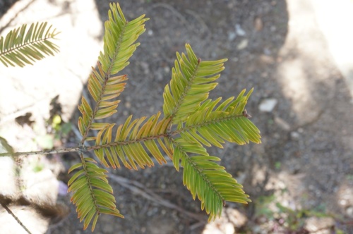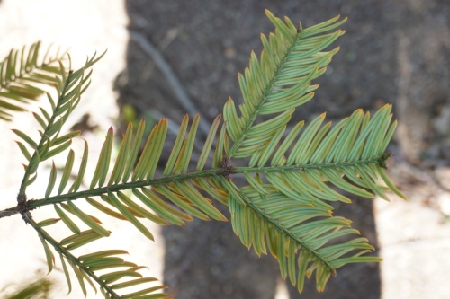 針葉樹にしては樹形がいびつで、葉は平面に並び、葉裏に白く幅広い気孔帯が2本、枝の基部の葉は短く、葉先は触っても痛くなさそうに見えます。