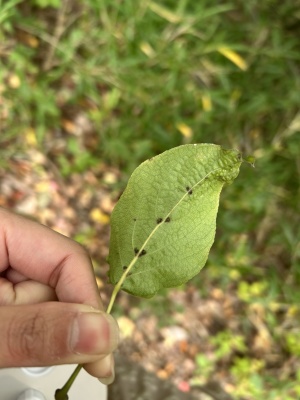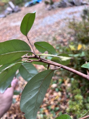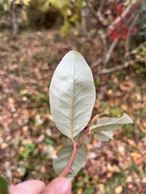葉の表面と裏面です、小さくて疎らな鋸歯が見られます。葉の大きさは3〜4cmのもので、画用紙ぐらいの硬さです。茎は黒っぽいものです。どうぞ宜しくお願いいたします、
