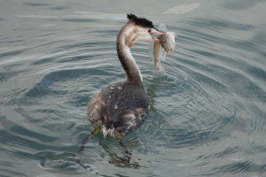 増加してきたカンムリカイツブリが護岸近くでハゼ類を捕食した