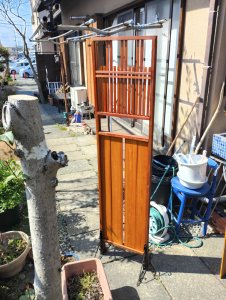 柿渋の話を聞き玄関に置いている手作りの目隠しを拝見 枠は松、中の板や格子は檜を柿渋で色付けしたそうです おばあさんが長野の出で海野格子はそこから来ているとのこと 先祖は真田家 格子の組み方が特徴あるそうです