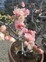 多分ボケ 左富士さんの木瓜の盆栽が思い出された 盆栽を大事に育てていらっしゃって 水遣りなど御家族の方がシッカリやっているのかしら 天国からハラハラしているのか、安心していらっしゃるのか・・