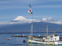 ← 海辺に出たら日の丸掲げた漁船と富士さんが、いかにも正月らしくて〜♪