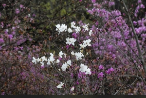 >ハリコは、ピンクのミツバツツジに混じって咲く、シロバナミツバツツジです。