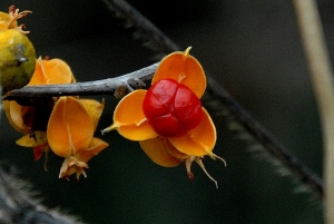 黄色い殻を開いて、赤い実が顔をのぞかせた所です。