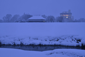 今年も、自宅から福島潟まで、雪でした。時折、吹雪です「ビュー福島潟」と「潟来亭」の写真です。