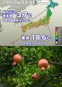 東京都心も3か月ぶりに最低気温が20℃を下回りました。関東は昼間も涼しく、