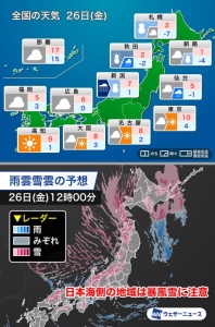 本日26日(金)は全国的に寒くなり、特に西日本では真冬並みかそれ以上の厳しい寒さとなるとか・・・