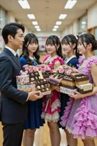 日本のバレンタインデーに男性が若い女性5人からどっさりチョコレートをもらっている様子を、明るく楽しく描いて下さい。
