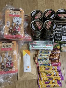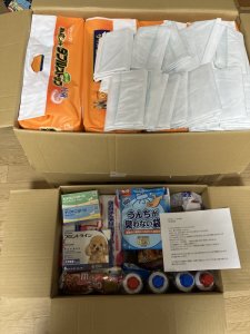 お手紙と共にペットシート・エチケット袋・フード・おやつ等を