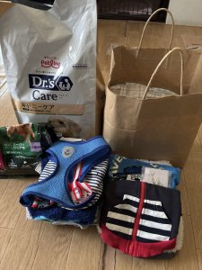 東京都葛飾区M様より犬用フード、おやつ、マナーウエアなどを頂きました。