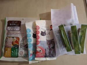 犬用フード、おやつ、ハーネス、ペットシート、お菓子を頂きました。