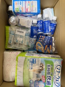 お手紙とともに、犬用フード、ペットシーツ、おむつ、フィラリア予防薬等を頂きました。