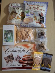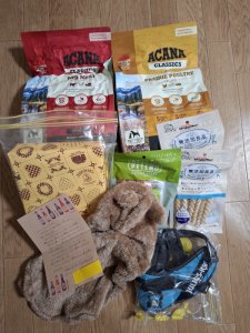 お手数と共に犬用フード、おやつ、ハーネス、お洋服、お菓子を頂きました。