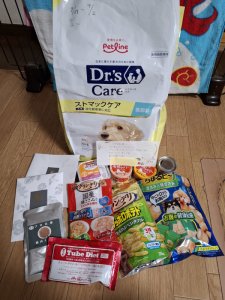 メッセージと共に犬用フード、おやつ、猫フード、トイレシート、Amazonギフト、お菓子を頂きました。