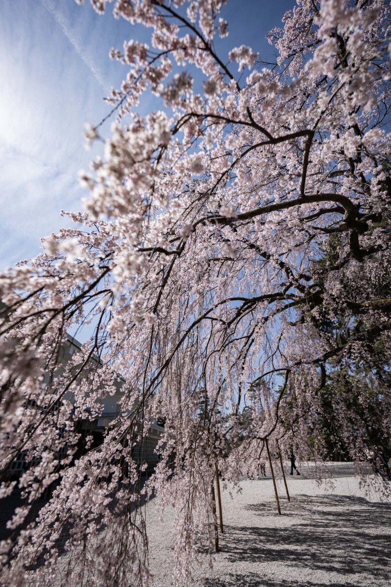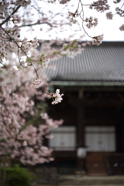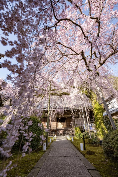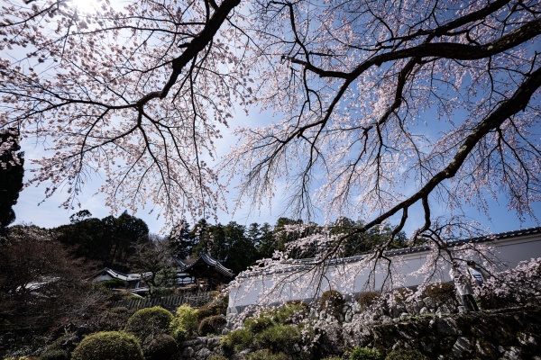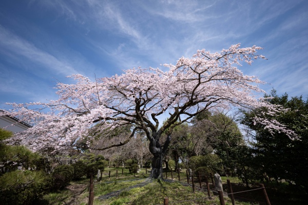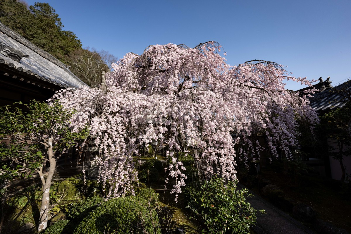 本堂横に咲く江戸彼岸系統の大きな一本桜で、滝のように優雅に垂れ下がる姿が美しいです。