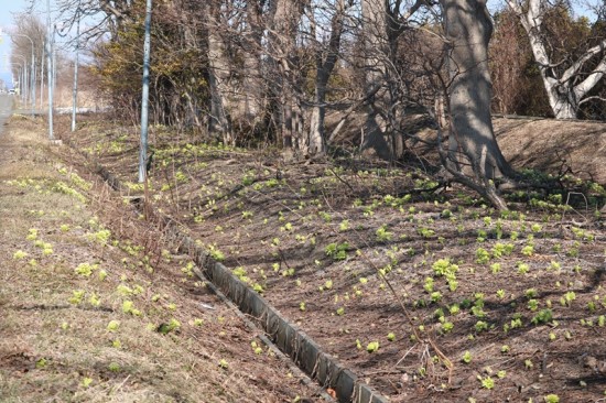 畑のそばの道端にフキノトウが大群生。100メートル以上も続いています。
