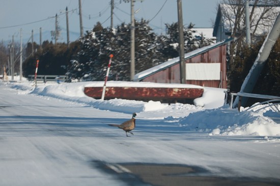 街中の道路を我が物顔で横断するコウライキジです。ボケました。