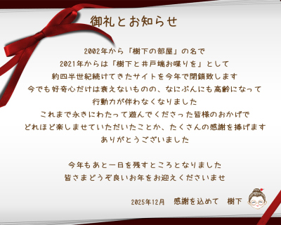 最近は開店休業状態の我がサイト、いよいよ閉鎖することにしましたが、時々こちらへ顔を出させて頂きたいと思ってますので宜しくお願い致します。