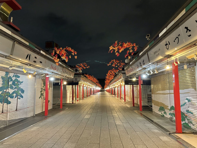 人っ子一人いない仲見世通りは、まるで芝居の書き割りのようでとても面白いと思いました!
