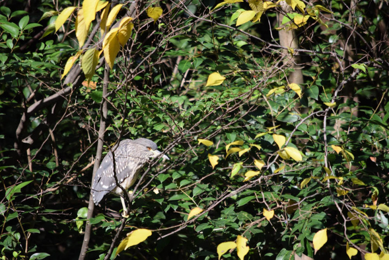 天気が良いので近くの公園まで行ったら、池の中州の木にゴイサギの幼鳥(星の模様があるのでホシゴイとも呼ぶそうですね)が、ジッと止まってました。