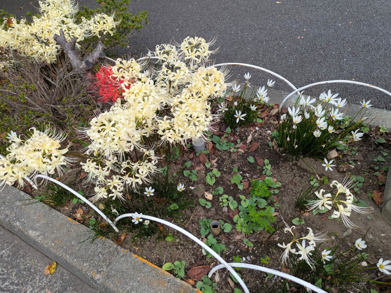 私も神社の参道で、紅白の彼岸花とタマスダレを見つけました。