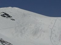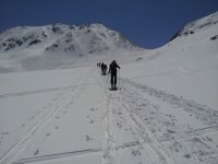 昼近くになるとやっぱり日差しが強く雪も水を含んで、ドダ〜〜とした雪に。でも、真っ白な雪に何とかシュプールを残してきました。