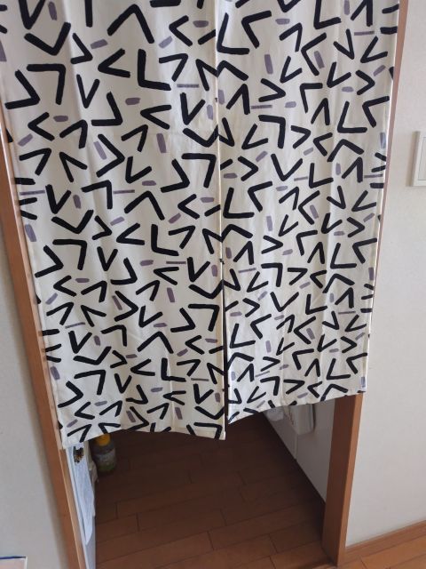 出来上がったキッチンののれんです 今までベットカバーにしていた布の再利用です(⌒∇⌒)
