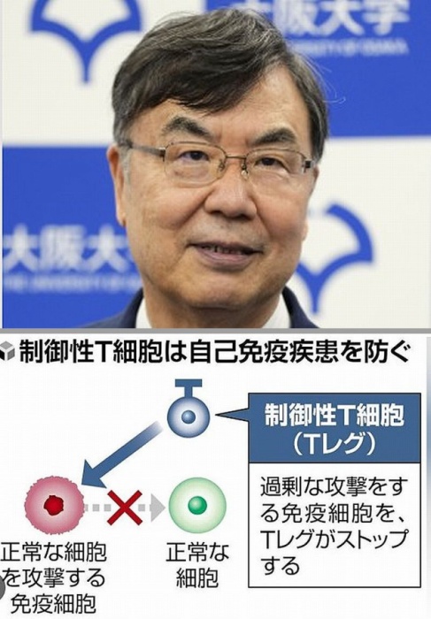 体内の過剰な免疫反応を抑えるリンパ球の一種「制御性T細胞」を発見した坂口志文大阪大特任教授(74)と米国の2氏の発表でした。