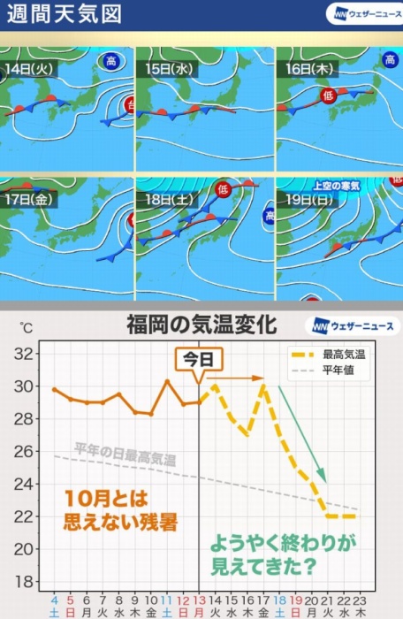 12日(日)には鹿児島県肝付町で35℃を観測し、国内でも観測史上最も遅い猛暑日の記録を更新しました。