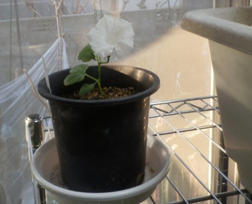 昨年の12月庭の朝顔を整理していたら、こぼれ種からの発芽の双葉の子があったので、ダメもとで鉢植えして、室内の棚に置いていたら、2月に2輪、3月にも2輪小さめの白い花が咲きました。