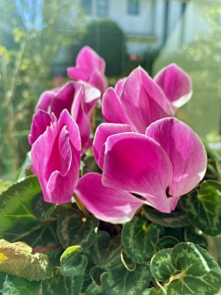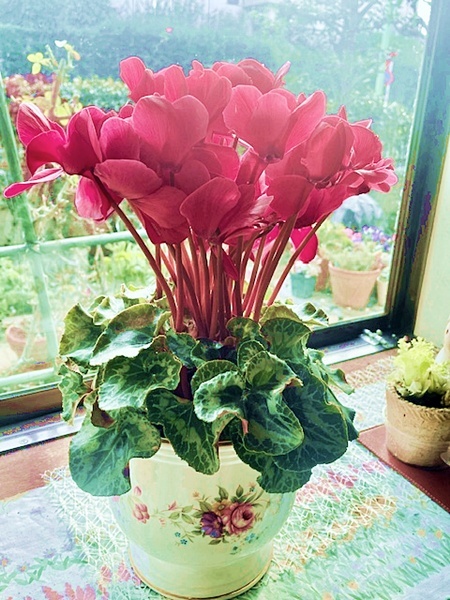 明るい日差しの中で真っ赤なシクラメンがちょっと重々しい??? 今までは決して買わないシクラメンの色・・・ いつも淡い色合いのピンクや斑入りを買っていましたが先月の寒さ厳しい中の店頭で凛と咲く様にひかれて初めてこの色の鉢を買いました。 窓辺で咲く様子、逆光を浴びている姿、 買ってよかったと思ってます。