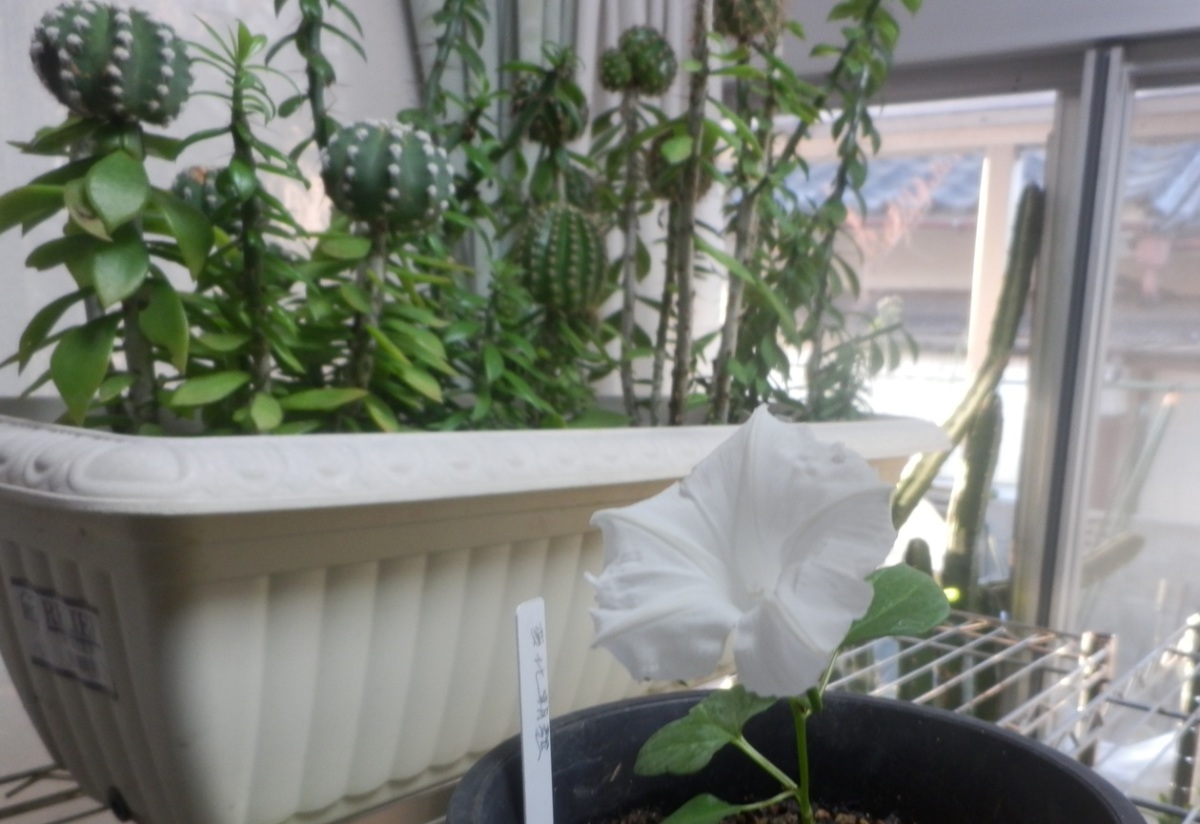 昨年の12/28に玄関先の変化朝顔のスプリットペタルと、アコーデオン沿いの変化朝顔(青花・白花)を整理して、種取りもしましたが、こぼれ種から1本双葉が出た苗を見つけたので、ダメもとで鉢植えにして家の中のサボテンの実生接ぎの棚に取り込んでいましたが、蕾が2つついていました。どんな花が咲くか楽しみにしていましたが白花でした。