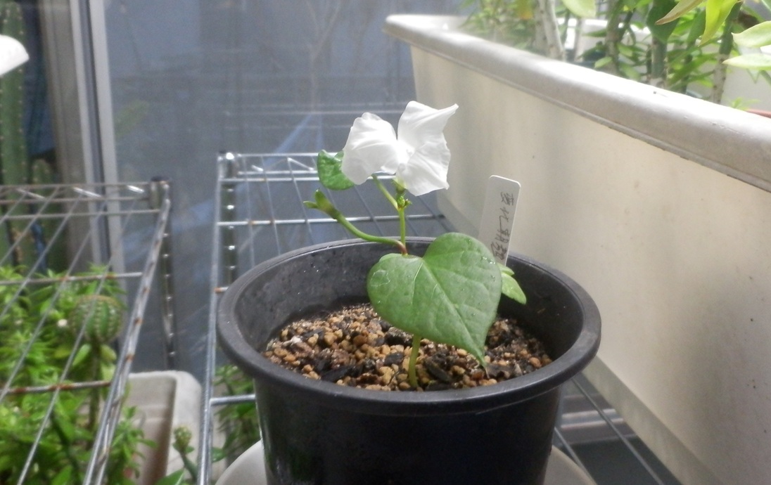 昨年の12/28に玄関先の変化朝顔のスプリットペタルと、アコーデオン沿いの変化朝顔(青花・白花)を整理して、種取りもしましたが、こぼれ種から1本双葉が出た苗を見つけたので、ダメもとで鉢植えにして家の中のサボテンの実生接ぎの棚に取り込んでいましたが、蕾が2つついていました。どんな花が咲くか楽しみにしていましたが白花でした。