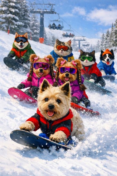 犬と猫さんたちの楽しいスノボーで今年の掲示板じまいです