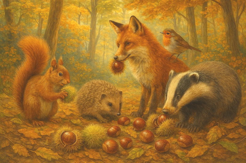 写真がないのでのAIのお助けで動物たちの栗拾いです。