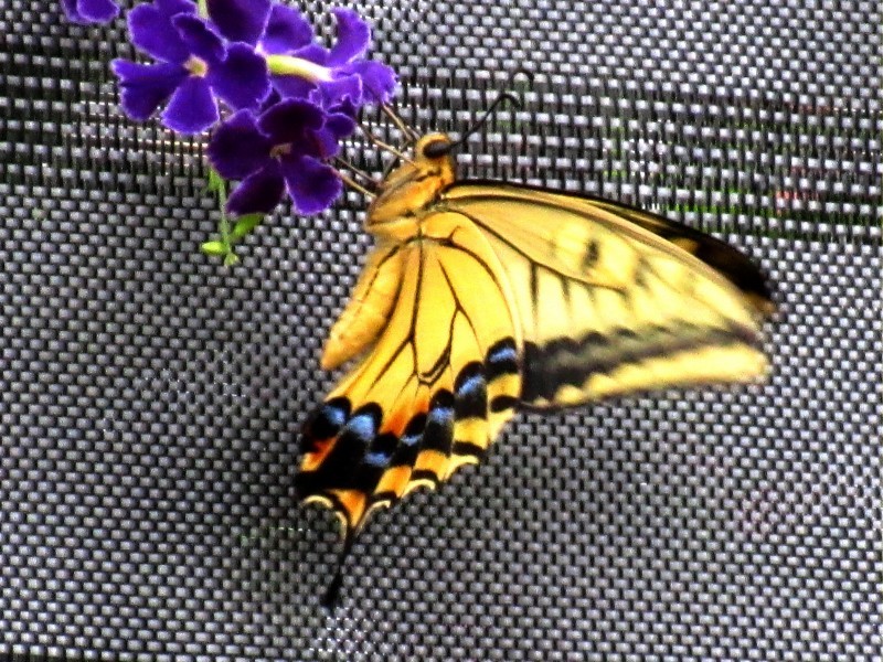 庭のデュランタの花にアゲハ蝶がとまっていました。
