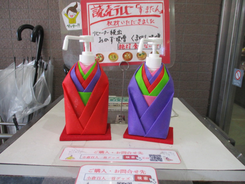 道の駅の入り口に消毒薬の容器に可愛らしい着物を着せて