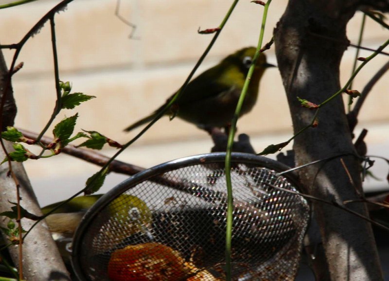 そこにめじろがいましたがよく見ると網の中にミカンらしきものが入れてあります我が家のベランダに置くのと一緒ですが大きな木に網を置くのも大変と思いました。メジロさん達良かったね。