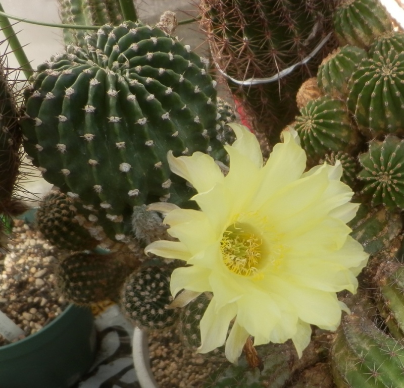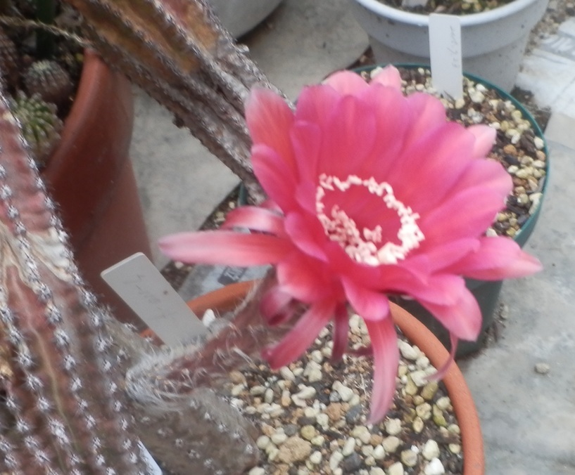 7-23-4×熱き心は、昨年7月にウチワ台木に実生置き接ぎされて、10ヶ月ほどで開花とは、素晴らしいです。サボテン本体より大きい花が咲くのも嬉しいですね。キリンウチワ台木より、ウチワ台木の方が成長が速いのでしょうか?