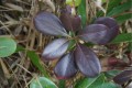 福岡県の舗装路横の土手で紫色の葉をつけた木が生えていました。