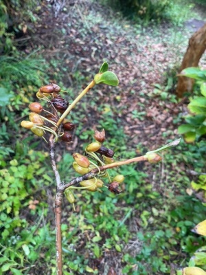 枝先に葉が茂り、垂れ下がった花の後で稔る果実は上を向くツツジ科