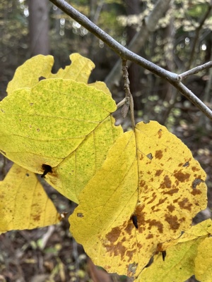 左右非対称のゆがんだ菱形〜平行四辺形の葉で、片側の葉縁下部が直線的、冬芽の感じなどから、マンサク科のマンサクを候補に。