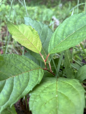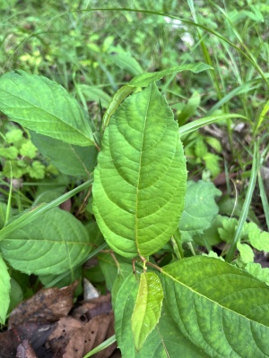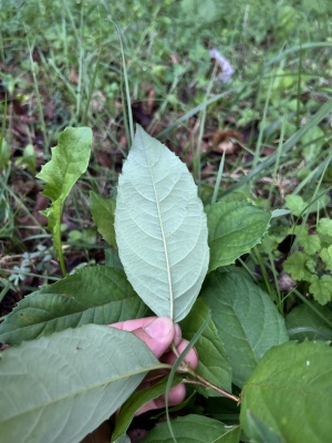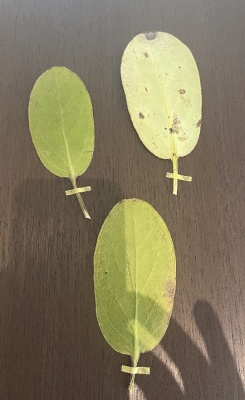 葉先が丸みを帯び、葉の基部は葉柄へ流れ、葉柄が葉身の1/3以上あるように観えます。