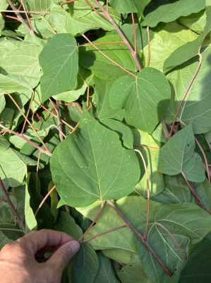 枝は互生ですが、ひと所から放射状に枝が出ています。葉はハート型か三列葉です。