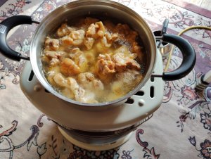 鶏もも肉を煮込み汁を川に捨てるのですが 昨日は野菜を入れストーブにかけました