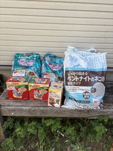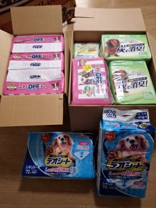 テレホンカード、犬用フード、トイレシート、オムツ、おもちゃを頂きました。